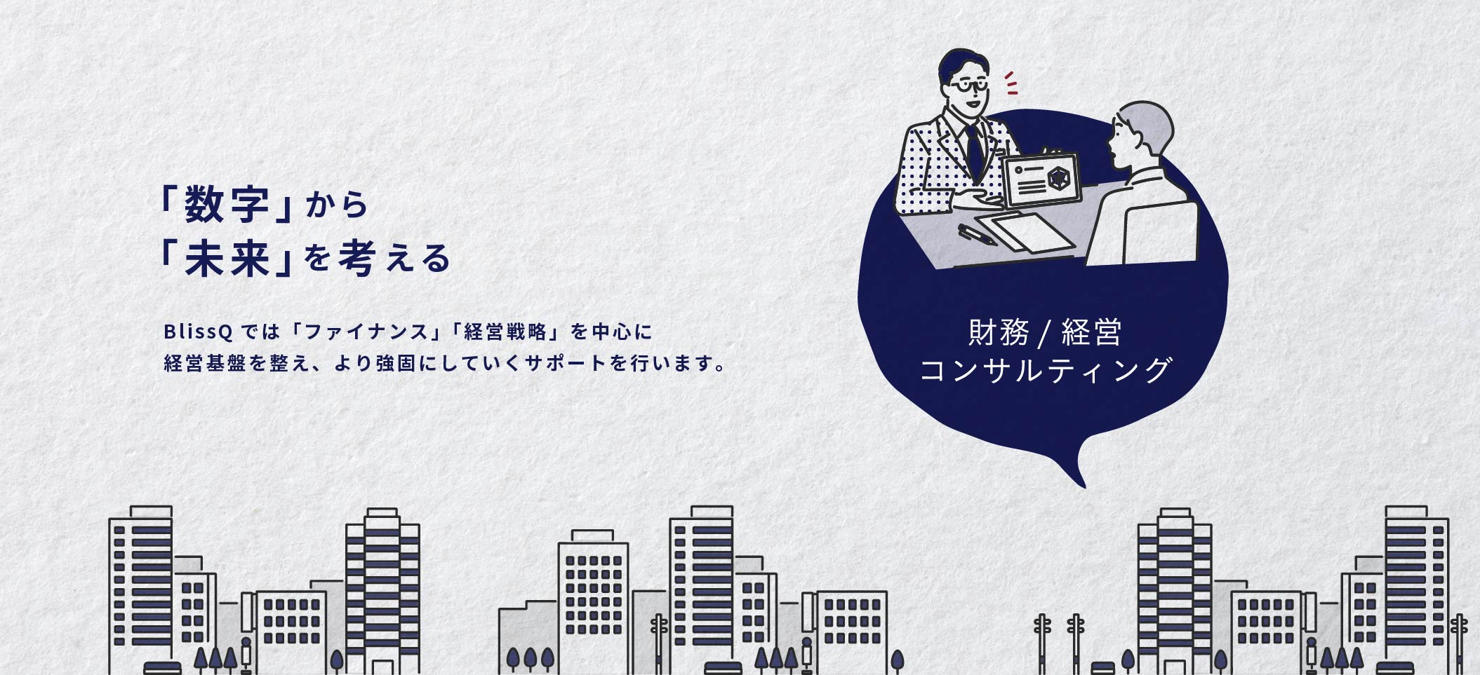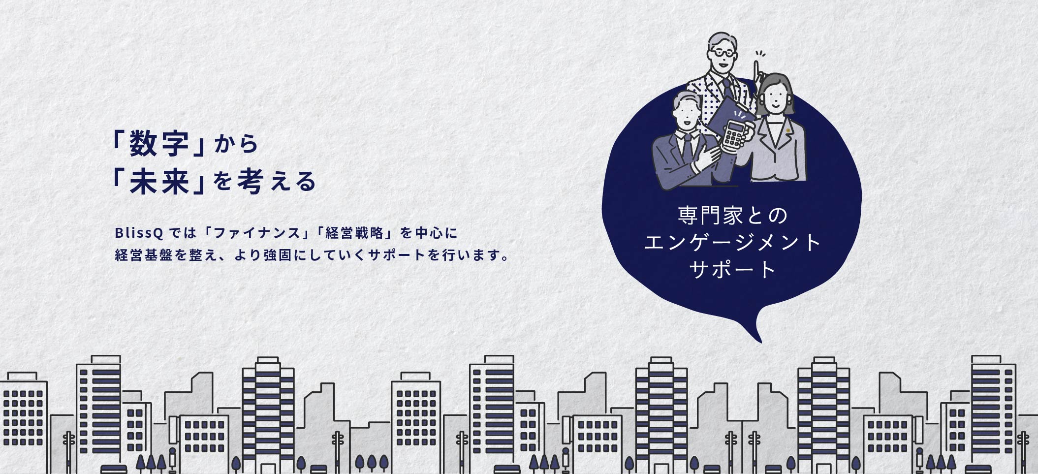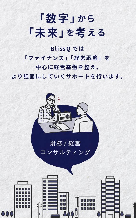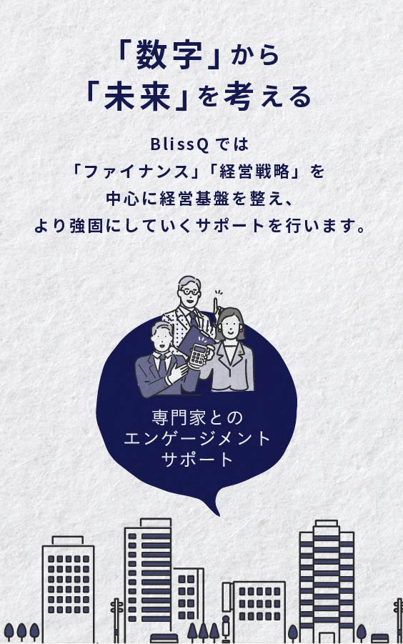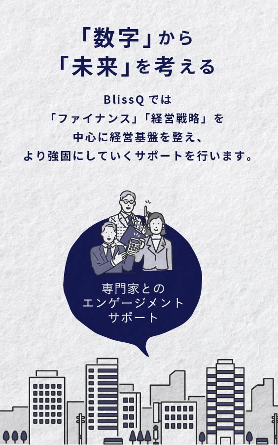 BlissQでは専門的知識を有したスタッフが、企業の幸せ(Bliss)に貢献できるような質の高い(Quality)答えの探究(Quest)を行ってまいります。